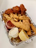 2 mozzarella sticks, 2 hot bites, 2 chicken strips, 4 hot wings, french fries.